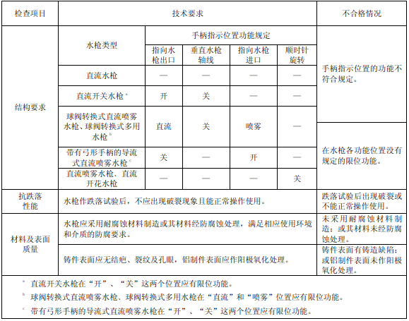 6.11.1.2.1 目測檢查消防水槍各操縱機構動作及限位的情況、指示標記、材料及表面質量。直流噴霧水槍﹑直流開花水槍,其調節噴霧角和開花角的旋轉開關的旋轉方向可從水槍的進水口觀察。